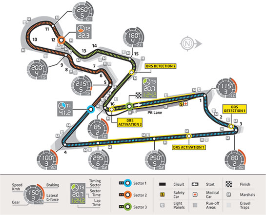 În speranţa că numărul de depăşiri va creşte în acest an, FIA a menţinut cele două zone de activare a sistemului DRS şi a crescut lungimea uneia dintre ele: prima este pe linia dreaptă de start-sosire, iar a doua pe lunga linie dreaptă dintre virajele trei şi patru, această zonă fiind chiar extinsă cu 80 de metri. Cele două zone de activare au două zone distincte de detecţie, la ieşirea din virajul 15 şi, respectiv, la intrarea în virajul 3.