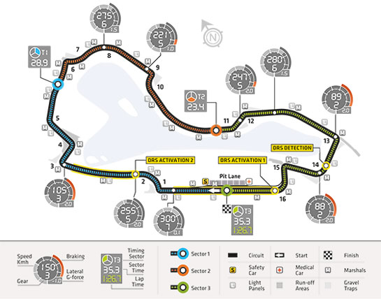 Regulamentul sistemului DRS a rămas cu cel de anul trecut: există un singur punct de detecţie pentru diferenţa de o secundă între doi piloţi, situat cu 13 metri înainte de virajul 14, şi două zone de activare. Prima dintre ele începe cu 762 de metri înainte de primul viraj, în timp ce a doua este amplasată cu 510 metri înainte de intrarea în virajul trei.